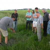 Op donderdag 23 juni stapte een groepje Glinzers samen met het projectteam op de fiets om het Fivellandschap nabij het dorp te verkennen. Tijdens deze landschapsexcursie, onder leiding van landschapshistoricus Jeroen Wiersma, werd een route gefietst via de Godlinzer Oudedijk, Kolhol en de Hooiweg. Onderweg werd er op drie plekken gestopt om te kijken naar de historische kenmerken van het landschap en te luisteren naar de toelichting van Jeroen. Zo nu en dan aangevuld met een persoonlijke anekdote van een van de Glinzers, die opgroeide in dit gebied. Bij de vierde stop verrichtte archeoloog Gerard Aalbersberg twee keer een handboring in de grond, op zoek naar de bedding van rivier de Kleine Tja Riet. De excursie werd afgesloten met een boring in de wierde van Godlinze, in de voortuin van de voormalige pastorie. Er werd geboeid gekeken naar de handelingen van de archeoloog toen hij met een grondboor verschillende oude lagen grond naar boven haalde. Deze waren prachtig te zien. Het was een zeer leerzame en gezellige avond.