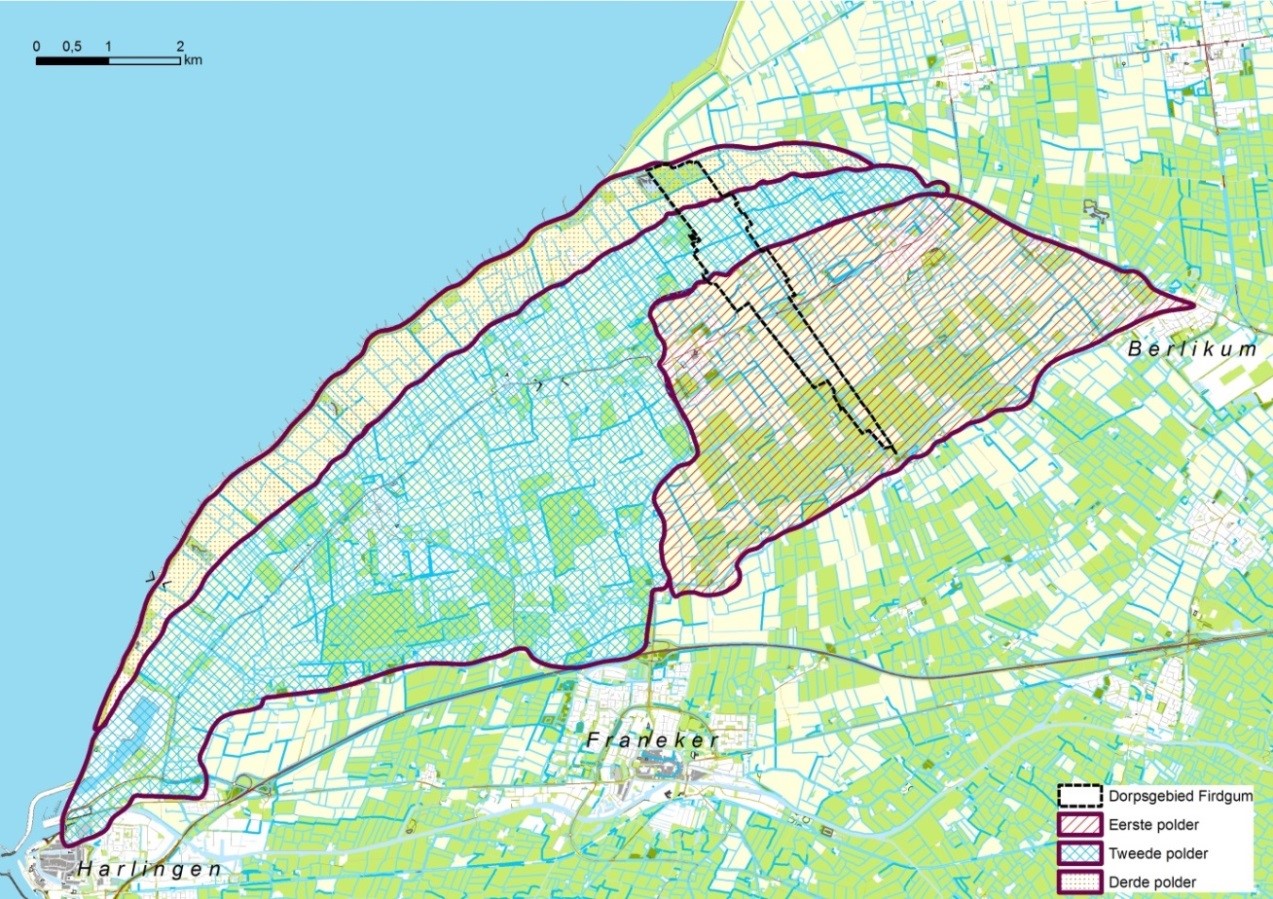 Een volgende inpoldering vond plaats door aanleg van een dijk net boven de dorpen Minnertsga-Oosterbierum-Sexbierum-Pietersbierum (Oude Dijk of Hoarnestreek). Deze dijk begon even ten noordoosten van Minnertsga en liep helemaal door tot aan Harlingen. Zeer waarschijnlijk waterde de polder ter hoogte van Firdgum af naar het zuiden via de Ried, omdat in de dijk boven Firdgum geen zijlen bekend zijn.34 Wel wordt een enkele keer een Sylroede genoemd in de Registers van de Aanbreng uit 1511.