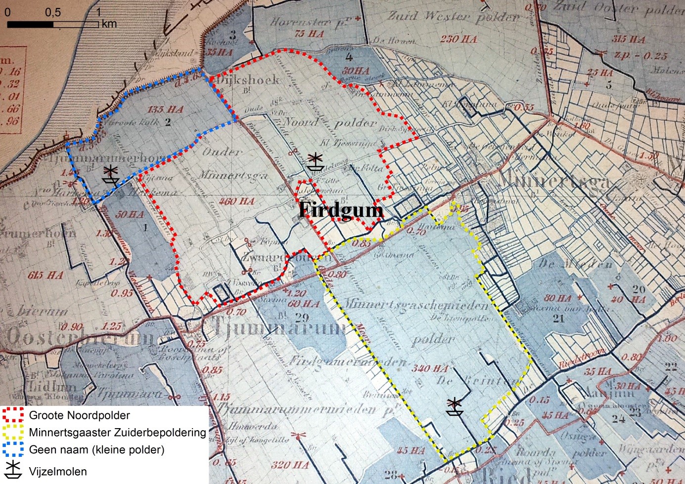 Eén van deze molens stond in de Firdgumer mieden en werd ingezet voor het bemalen van de in 1837 opgerichte Minnertsgaaster Zuiderbepoldering. In 1916 werd de polder omgevormd tot een waterschap. Een andere molen stond iets ten noorden van de Hearewei op de grens tussen Firdgum en Minnertsga. Deze molen werd in 1871 geplaatst voor het bemalen van de van de Groote Noorderpolder die eerder dat jaar tot stand was gekomen.41 In mei 1880 werd tijdens een vergadering van de gecommitteerden en ingelanden van de particuliere Groote Noorderpolder besloten om de polder om te vormen tot een waterschap. Nog in hetzelfde jaar werd een officieel verzoek tot omzetting van de polder in een waterschap ingediend door J.T. Lettinga en een aantal andere personen uit Minnertsga, Firdgum en Tjummarum. Het provinciaal bestuur besloot daarop in 1881 tot oprichting van het waterschap. Het waterschapsreglement werd in 1882 van kracht.42
