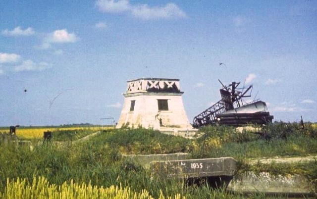 Foto van de dijk bij Oosterbierum. De verschillende stenen geven de hoogte van de dijk aan in het jaar 1570. 1574, 1930 en 1933 aan. In de jaren ’60 werd de dijk opgehoogd tot deltahoogte (9 meter 40.). Deze foto is genomen in 1970. (Foto: www.oudtzummarum.nl)