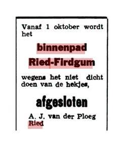 Deze boerderij is in de loop van de 19de eeuw uit het landschap verdwenen. Het voetpad splitste zich net voor de boerderij richting Brunia, een boerenplaats aan de overkant van de Firdgumer Oude Meer. Via een zet (een eenvoudige, verplaatsbare brug op balken) was deze boerderij te bereiken. Het voetpad liep langs Brunia richting de Ried. Daar kon men het water oversteken om vervolgens via de tegenwoordige Anemareed in het dorp Ried aan te komen. Rond 1930 was de situatie anders. De Nieuweweg was aangelegd, en de Ried kon via deze weg worden overgestoken. Vanaf daar was aansluiting op het binnenpad naar de Firdgumer Miedlaan. In 1966 werd dit pad afgesloten wegens het niet dicht doen van de hekjes.44 De huidige verbinding met Firdgum langs de tegenwoordige Mienskarleane kwam pas tijdens de ruilverkaveling tot stand.