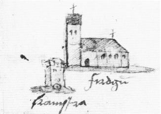Schotanus geeft ons een beeld van de ligging van de boerderijen in het dorpsgebied van Firdgum rond 1718. Van de in totaal acht boerderijen heeft Camstrastate net iets meer inkt en aandacht gekregen dan de andere boerderijen. Het was dan ook een statige plaats die in ieder geval al vanaf 1369 in handen was van de vooraanstaande familie Camstra. Lieden van deze familie hebben hier een aantal eeuwen lang de beschikking gehad over een stins. De stins werd in de 16de eeuw afgebeeld als woontoren met arkeltorentjes op de hoeken (afbeelding). De kelder van dit middeleeuwse gebouw is bewaard gebleven.54 Meer over de Camstrastate en de Camstra’s.