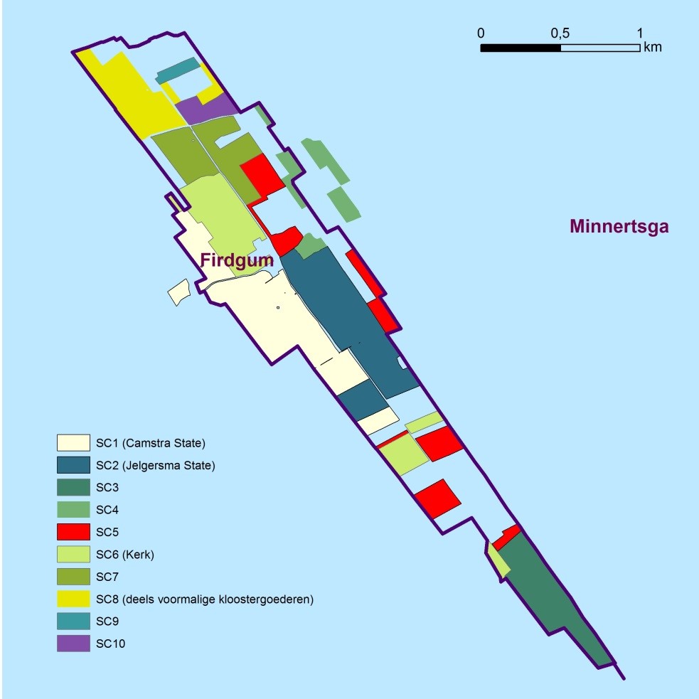 Uit de stem- en floreenkohieren is af te leiden welke landerijen in het dorpsgebied van Firdgum tot welke boerderijen behoorden. Rond 1640 waren er in totaal 10 clusters van één tot zes percelen. Elk cluster vormde een boerenbedrijf. Opvallend is dat de meeste clusters grote aaneengesloten blokken vormden. Dit lijkt erop te wijzen dat eerst de grote blokken zijn ontstaan, die vervolgens in percelen zijn opgedeeld.57