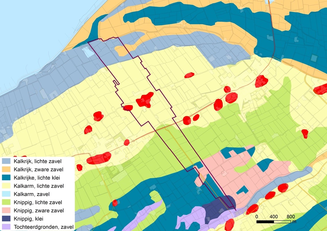 Het grillige verloop van een aantal oost-west lopende sloten markeert de ligging van voormalige geulen, die tijdens een bodemkartering in de jaren ’60 zijn aangetroffen.