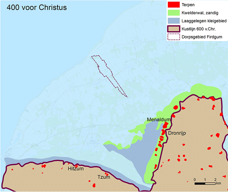 Rond 600 voor Christus lag de grens tussen wad en kwelder in Westergo ten noorden van de lijn Harlingen-Winsum en ten Westen van de lijn Winsum-Beetgum. Er was dus sprake van een trechtervormig getijdenbekken met daarachter het oude land, dat gezien de verschillende nederzettingen uit de Late Bronstijd en Vroege IJzertijd al rond 800 voor Christus was opgeslibd tot een bewoonbaar kweldergebied.13 Langs de lijn Winsum-Beetgum kwam een kwelder tot ontwikkeling, die rond 600 voor Christus in de pioniersfase verkeerde.