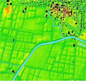 Uitsnede van de hoogtekaart (AHN2). De kruinige percelen zijn rondom Ulrum nog op veel plaatsen waar te nemen, bijvoorbeeld op het voormalige kerkeland langs het Hunsingokanaal. Tegelijkertijd is op deze kaart te zien dat er veel van deze bolle akkers zijn geëgaliseerd, waardoor het landschap een stuk minder reliëfrijk is geworden.